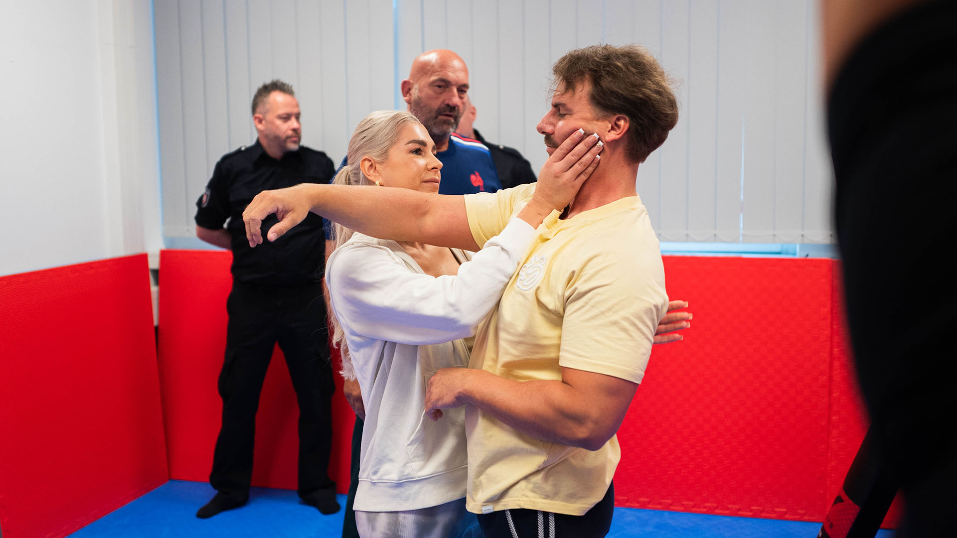 Auf dem Plan steht aber auch Fitness: Im eigenen Trainingsraum erhalten die Czoks vom Ordnungsdienst-Mitarbeiter Jens eine erste kleine Einheit zur Nahkampfausbildung. Die wöchentlichen Sporteinheiten gehören hier zur Arbeitszeit – denn wer in der Waffenverbotszone kontrolliert, sollte wissen, wie er sich schützt.